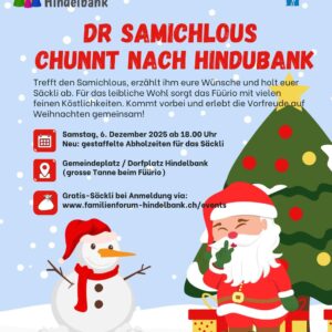 Am 06.12. ist es wieder so weit – der Samichlaus kommt! 🎅 Der Samichlous kommt nach Hindelbank! 🌟 Dieses Jahr besucht uns der Samichlous auf dem Dorfplatz vor der Gemeinde, bei der grossen Tanne – ein besonderer Moment für Gross und Klein! Lasst euch überraschen und vergesst euer Versli nicht – denn nur wer eines […]