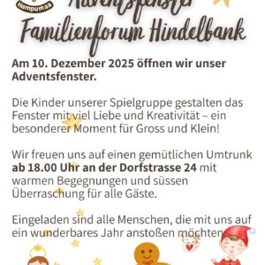 🎄 Adventsfenster vom Familienforum & der Spielgruppe 🎄 Am 10. Dezember öffnen wir gemeinsam unser Adventsfenster. Die Kinder unserer Spielgruppe gestalten das Fenster mit viel Liebe und Kreativität – ein besonderer Moment für Gross und Klein! Wir freuen uns auf einen gemütlichen Umtrunk ab 18.00 Uhr an der Dorfstrasse 24 mit warmen Begegnungen und süssen […]